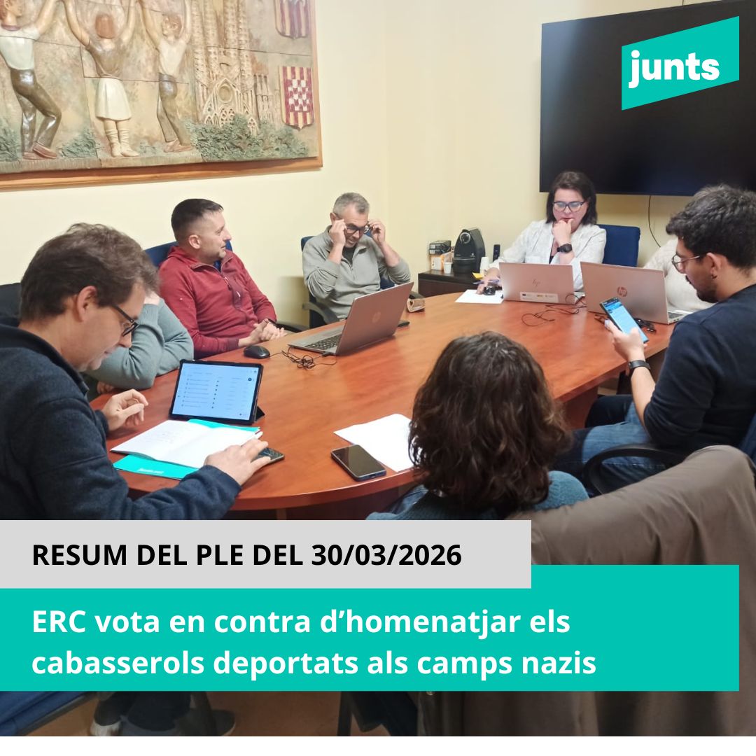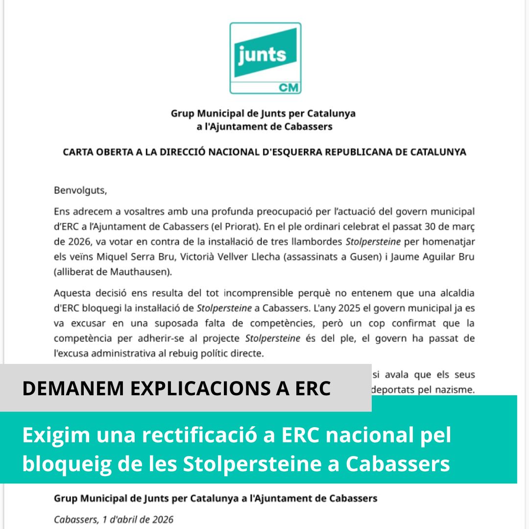 Davant la greu situació generada pel govern municipal al ple ordinari del passat 30 de març, on va votar en contra d’homenatjar els cabasserols deportats als camps nazis, hem enviat una carta a la direcció nacional d’Esquerra Republicana de Catalunya perquè aclareixi si avala aquest menyspreu a les víctimes del nazisme. Exigim també una rectificació…
