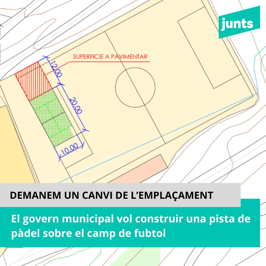 Hem presentat al·legacions al projecte que hi ha en exposició pública per construir una pista de pàdel sobre el camp de futbol, amb un cost de més de 70.000€. L’emplaçament és inadequat, ja que fa malbé una instal·lació esportiva que ja està amortitzada. Demanem al govern municipal que justifiqui la necessitat de construir aquesta pista…