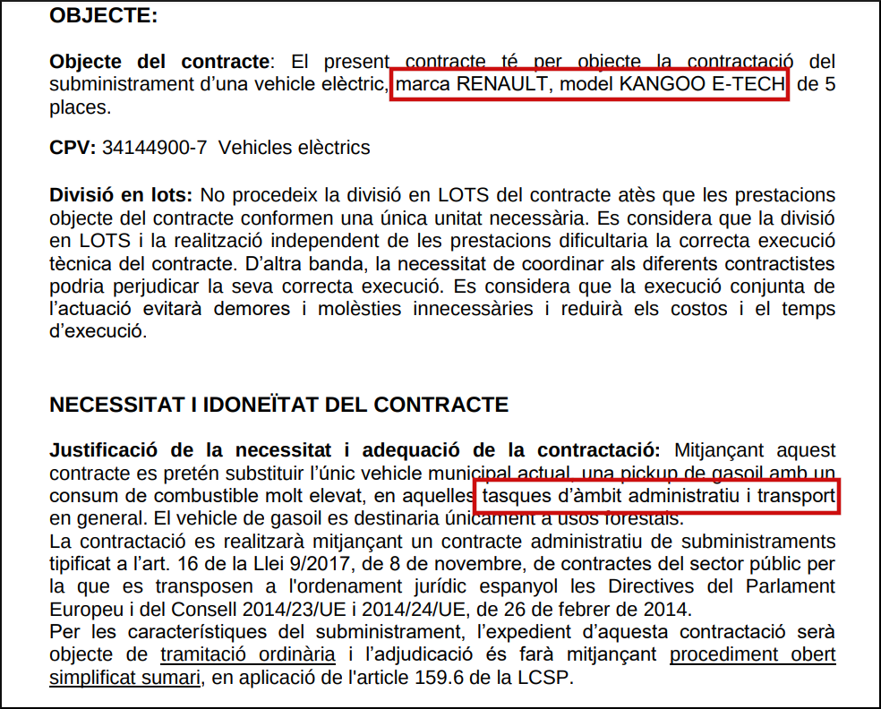El 28 d’agost la Plataforma de Serveis de Contractació Pública publicava una licitació de l’Ajuntament de Cabassers per adquirir el vehicle elèctric pel qual es realitzava aquella modificació del pressupost. La documentació adjunta respon la pregunta que havíem formulat al govern local: quin tipus de vehicle és i a quins usos es destinarà: és una Ranault Kangoo E-Tech de 5 places i es destinarà a tasques d’àmbit administratiu i transport en general (vegeu el document en PDF amb aquests detalls):