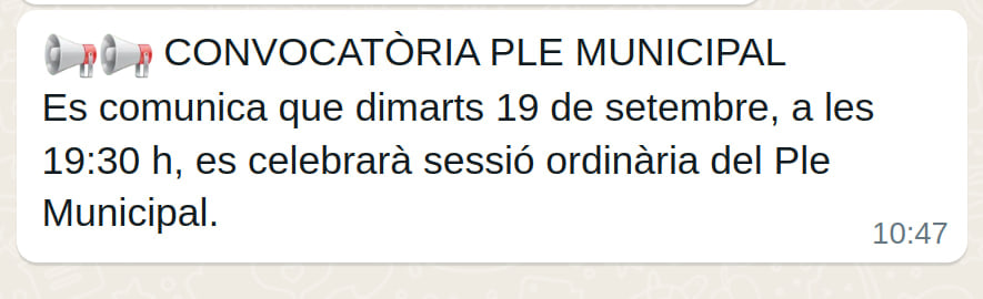 Tot i no ser a govern, amb la nostra acció a l’oposició hem aconseguit que l’Ajuntament de Cabassers comenci a respectar la normativa de transparència i que anunciï els plens. Avui s’ha difós pels canals oficials de l’ens, a Whatsapp i per la megafonia municipal, l’anunci de convocatòria del ple ordinari de demà:
