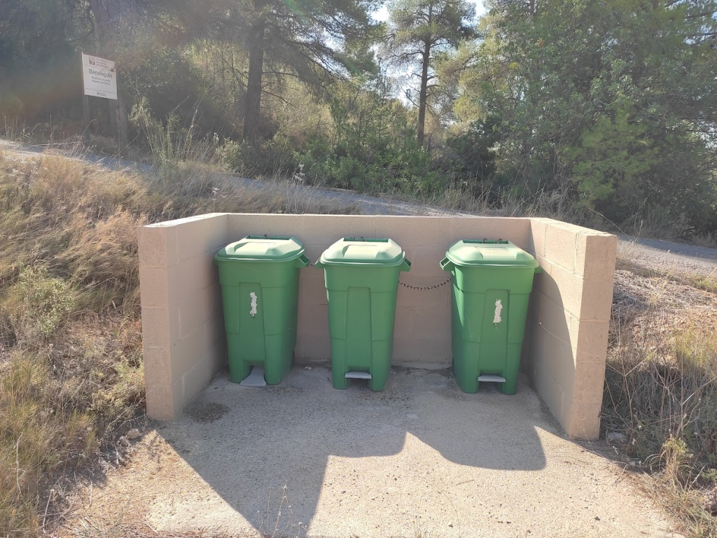 Punt de recollida del camí de la Foia: el contenidor de la dreta és per al vidre i el central i el de l’esquerra per a rebuig.