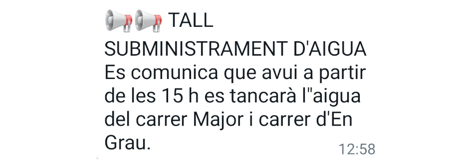 Celebrem que les interrupcions de subministrament d’aigua s’avisin amb prou temps com per a permetre l’abastiment d’urgència de la població, com demanàvem ahir. El tall d’avui s’ha anunciat amb 2h de marge. Tenir temps és fonamental per acumular l’aigua necessària per a passar l’estona que pugui durar la interrupció i cobrir les necessitats bàsiques: beure, cuinar i higiene. Tanmateix, ha faltat encara que es comuniqués el motiu del tall i la previsió de la duració de la interrupció (que finalment ha estat de més de 4 hores).