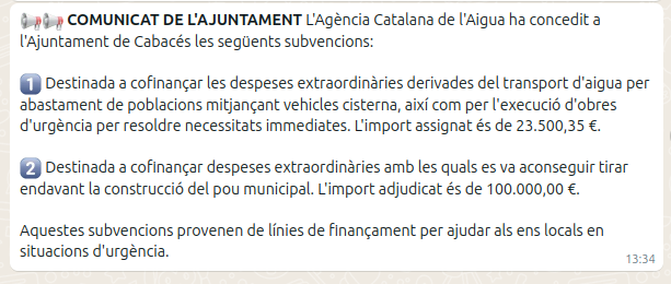 El govern municipal només informa de les subvencions que li atorga l’ACA i oculta les que li denega per mala gestió