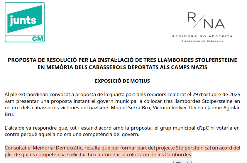 La proposta de resolució presentada per Junts i la regidora no adscrita, on hi consta el requisit d’aprovació de l’acord per part del ple per participar al projecte Stolpersteine. Vegeu el document sencer aquí.
