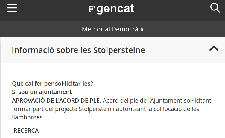 Captura de pantalla de la web del Memorial Democràtic de la Generalitat de Catalunya, que deixa clar que per participar al projecte Stolpersteine cal un acord del ple, no que ho sol·liciti cap entitat. Accediu a la web aquí.